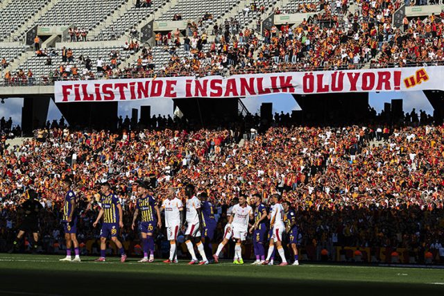 Trendyol Süper Lig’in 5. haftasında ikas Eyüpspor ile Galatasaray takımları, Atatürk Olimpiyat Stadı’nda karşılaştı. Galatasaraylı taraftarlar, tribüne ‘Filistin’de insanlık ölüyor’ yazılı pankart astı. ( Arife Karakum – Anadolu Ajansı )