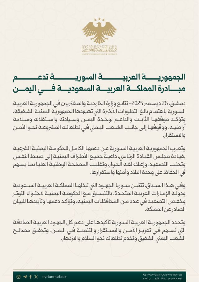 وقالت الخارجية إن سوريا تعرب عن دعمها الكامل للحكومة اليمنية الشرعية، داعية جميع الأطراف اليمنية إلى ضبط النفس وتجنب التصعيد، وإعلاء لغة الحوار وتغليب المصلحة الوطنية العليا.