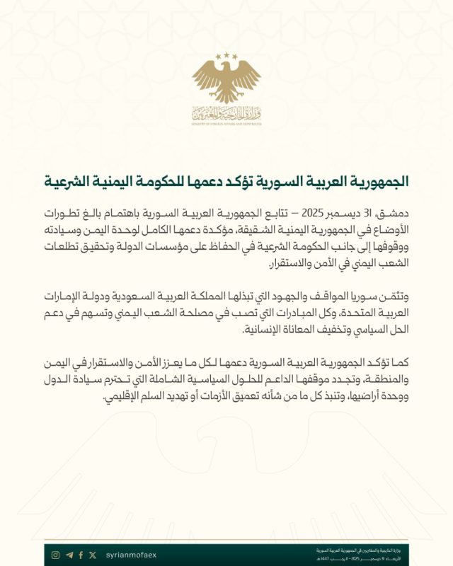 وأوضحت الوزارة، عبر معرفاتها الرسمية، الأربعاء 31 كانون الأول، أن سوريا تتابع باهتمام بالغ تطورات الأوضاع في الجمهورية اليمنية الشقيقة، مجددة دعمها الثابت لوحدة اليمن وسيادته، ووقوفها إلى جانب الحكومة الشرعية.