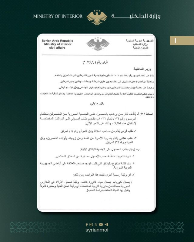 أصدرت وزارة الداخلية السورية , الجمعة 20 شباط , القرار رقم (144) المتعلق بتنظيم التعليمات التنفيذية لمنح الجنسية السورية للمواطنين الكرد المشمولين بأحكام المرسوم رقم (13) لعام 2026، محددة آليات التقديم وإجراءات دراسة الطلبات ضمن إطار قانوني وإداري واضح.